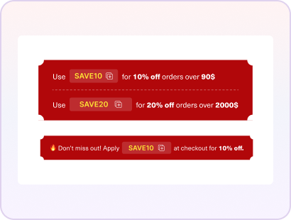 Shows discount codes right on the product page. This makes shoppers feel lucky and encourages them to buy now to use the savings immediately.