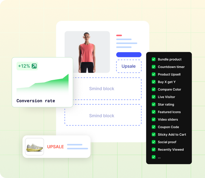 Smind Product Blocks offer a proven high-conversion layouts, and seamless integration with Shopify’s built-in features. Key benefits include faster page loading, design freedom, and the ability to test different elements to maximize sales.